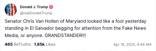 Trump wrote, “Senator Chris Van Hollen of Maryland looked like a fool yesterday standing in El Salvador begging for attention from the Fake News Media, or anyone. GRANDSTANDER!!!”