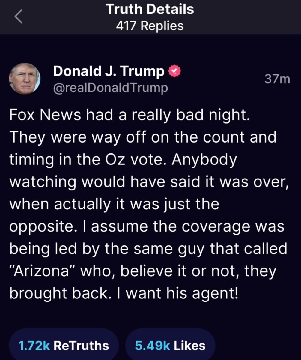 One post wasn’t enough though, for Trump also decided to take a swipe at Fox News for also reporting the primary was too close to call.