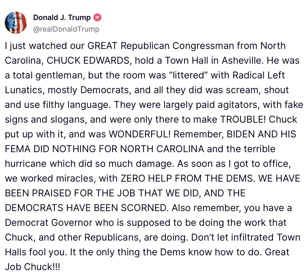 “I just watched our GREAT Republican Congressman from North Carolina, CHUCK EDWARDS, hold a Town Hall in Asheville.” Trump wrote. “He was a total gentleman, but the room was ‘littered’ with Radical Left Lunatics, mostly Democrats, and all they did was scream, shout and use filthy language.”