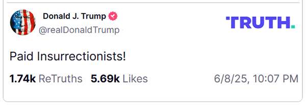 “Governor Gavin Newscum and “Mayor” Bass should apologize to the people of Los Angeles for the absolutely horrible job that they have done, and this now includes the ongoing L.A. riots,” Trump wrote in his first post. “These are not protesters, they are troublemakers and insurrectionists.”