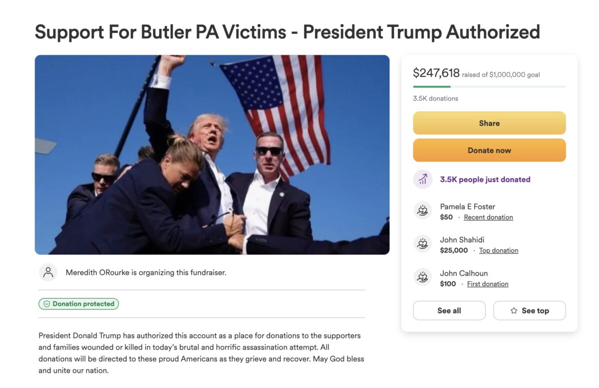 The GoFundMe description reads: “President Donald Trump has authorized this account as a place for donations to the supporters and families wounded or killed in today’s brutal and horrific assassination attempt. All donations will be directed to these proud Americans as they grieve and recover. May God bless and unite our nation.”