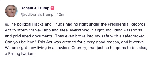 Trump took to TruthSocial to blast the DOJ and the FBI, calling them “political Hacks and Thugs” who “had no right under the Presidential Records Act to storm Mar-a-Lago and steal everything in sight, including Passports and privileged documents.”