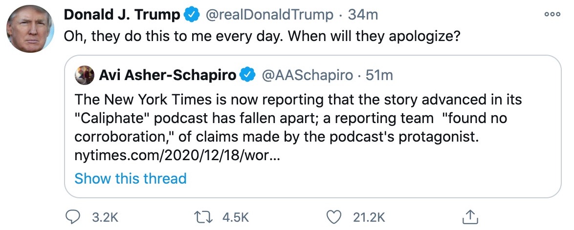 On Friday morning, the president took a victory lap of sorts after The New York Times was forced into a blockbuster retraction of its high-profile Caliphate podcast after failing to sufficiently scrutinize the claims of a Canadian man who claimed to have joined ISIS and taken part in executions carried out by the terrorist group. The man, Shehroze Chaudhry, has been arrested by Canadian authorities for allegedly carrying out a terrorist hoax — with officials claiming he fabricated his stories to the media.