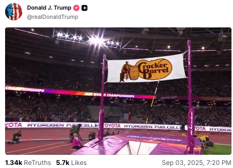 A video of “Trump” pole-vaulting over the now-abandoned new Cracker Barrel logo to reveal the old one.