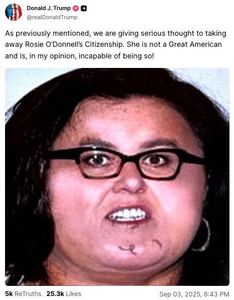 “As previously mentioned, we are giving serious thought to taking away Rosie O’Donnell’s Citizenship,” Trump wrote. “She is not a Great American and is, in my opinion, incapable of being so!”