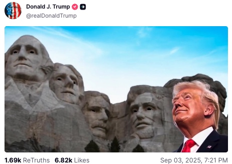 A video of Trump as a fifth head on Mount Rushmore set to Sam and Dave’s “Hold On, I’m Comin'”.
