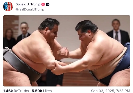 A video of “Illinois Governor JB Pritzker” and “former New Jersey Governor Chris Christie” as sumo wrestlers grappling with one another.