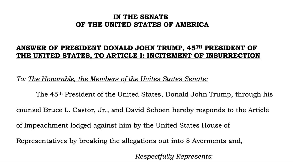 Trump’s legal representatives, David Schoen and Bruce Castor Jr. submitted a pretrial brief to the U.S. Senate on Tuesday in defense of the former president. The document carries the arguments they are expected to make about why Trump cannot be impeached for inciting the insurrectionist mob of his supporters who violently stormed the U.S. Capitol in order to overturn the 2020 election.