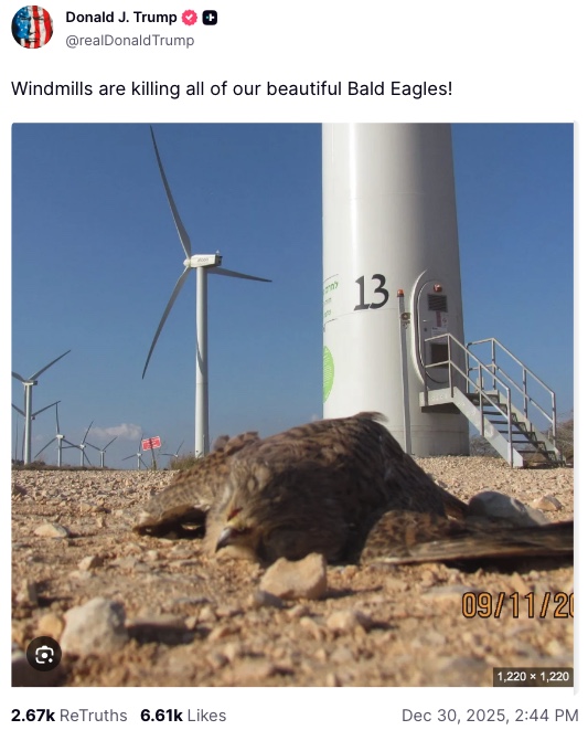 On Tuesday, the president fired off another missive in his long-running war on windmills by claiming that their turbines are culling America’s population of Bald Eagles. Trump posted screenshots of various claims about wind power before adding a fourth post featuring what appears to be a dead brown raptor of some kind.