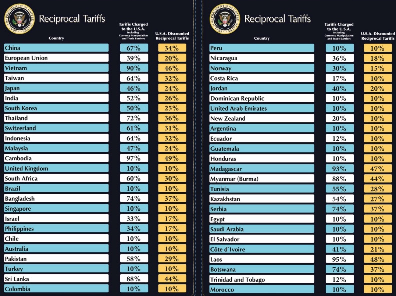 The second column is labeled “U.S.A. Discounted Reciprocal Tariffs,” which implies that Trump’s tariffs are merely a response to tariffs levied by other countries on U.S. goods and that Trump’s tariffs are “discounted,” as if their imposition were modest by comparison.