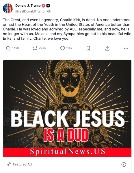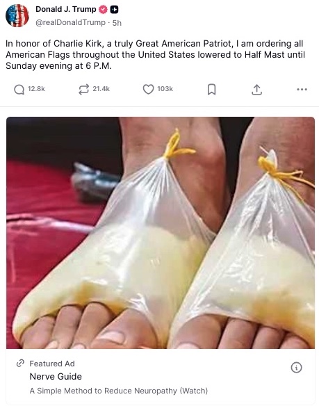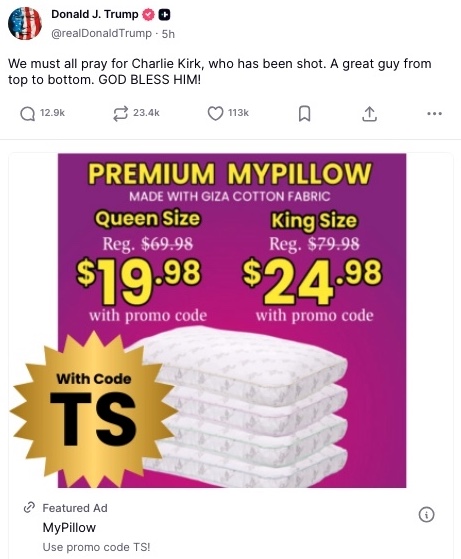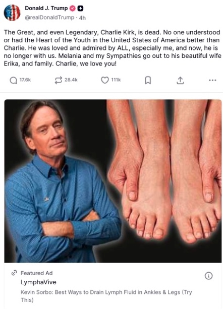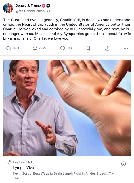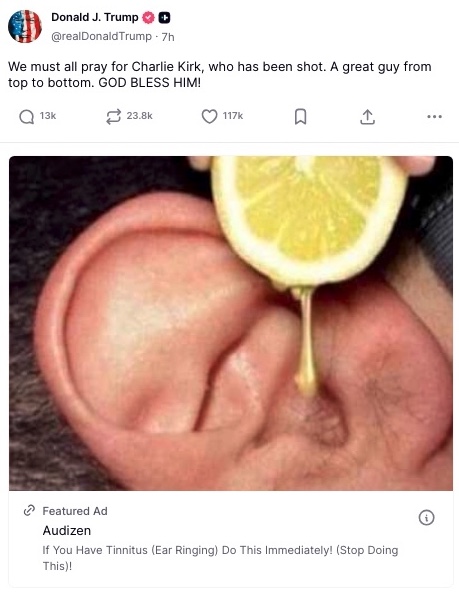 “We must all pray for Charlie Kirk, who has been shot,” Trump wrote after news of the shooting broke. “A great guy from top to bottom. GOD BLESS HIM!” Underneath the post, an ad for an alleged tinnitus remedy appeared.