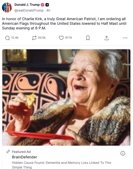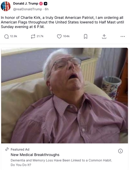“In honor of Charlie Kirk, a truly Great American Patriot, I am ordering all American Flags throughout the United States lowered to Half Mast until Sunday evening at 6 P.M.,” Trump wrote in another post. Underneath the post was an ad featuring an image of a map sleeping while sitting upright.
