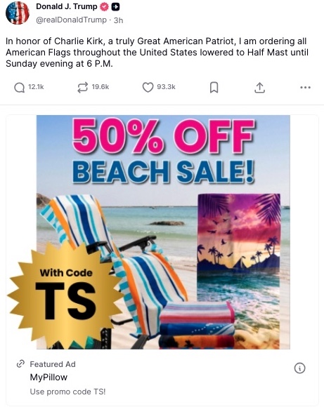 Trump’s Social Media Platform Serves Unfortunate Ads Next to President’s Posts Mourning Charlie Kirk’s Killing: ‘50% OFF BEACH SALE!’