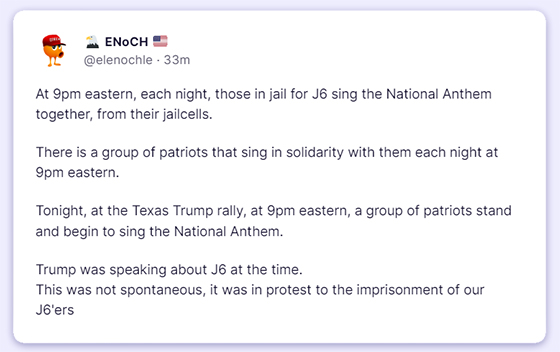 On Gettr and Truth Social, some users claim that the group who stood and began singing at 9pm Eastern did so because jailed January 6 defendants do so “from their jail cells.” Here’s one example: