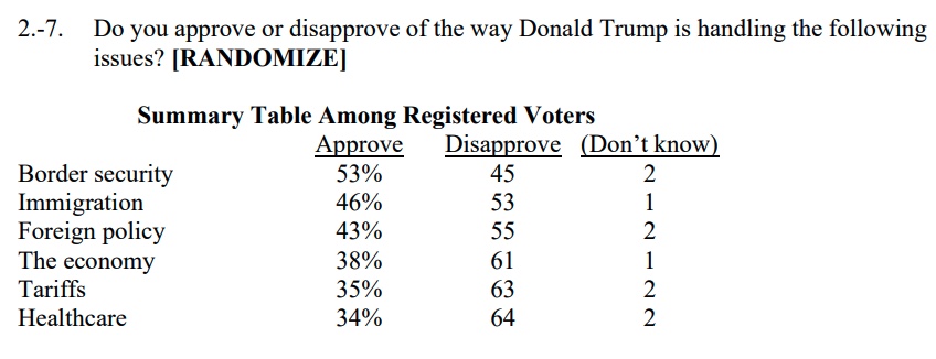 Trump is underwater in five out of the six issues the poll asked voters about. While the president has a 53% approval rating on border security, 53% of respondents say they disapprove of his handling of immigration in general, as well as other issues.