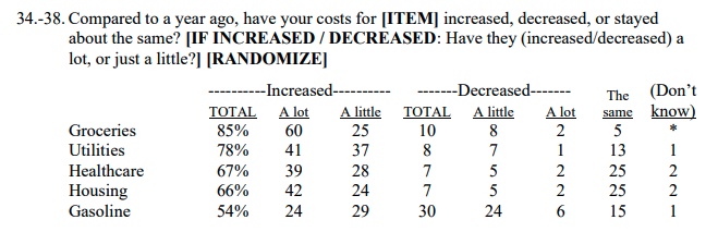 More than three-quarters of voters say the cost of groceries (85%) and utilities (78%) has increased compared to a year ago. Sixty percent say the cost of groceries has risen “a lot” since a year ago.