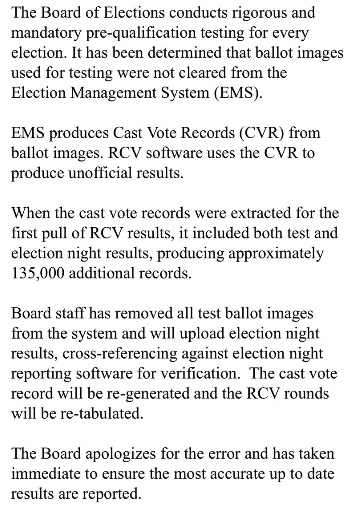 As it turns out, election workers forgot to remove tens of thousands of test ballots from the system before putting real ballots through the RCV tabulator.