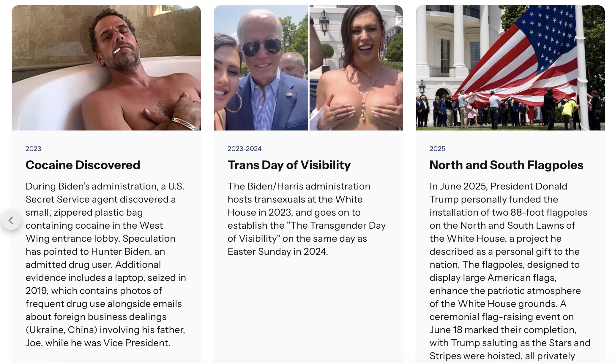 The Trump administration also added an entry on the “Muslim Brotherhood Visit” in 2012; an entry on former president Joe Biden hosting “transexuals at the White House, complete with a photo of a topless transgender influencer on the White House lawn; and an entry titled “Cocaine Discovered,” implying that the discovery of a “small, zippered plastic bag containing cocaine in the West Wing entrance lobby” had connections to “admitted drug user” Hunter Biden.
