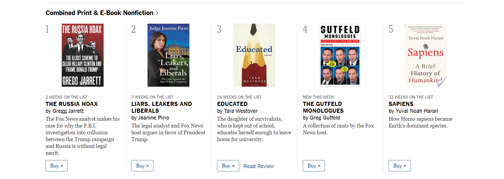 This week’s New York Times bestseller list is pretty Fox-y, with three of the network’s stars taking the top spots: Gregg Jarrett, Jeanine Pirro, and Greg Gutfeld.