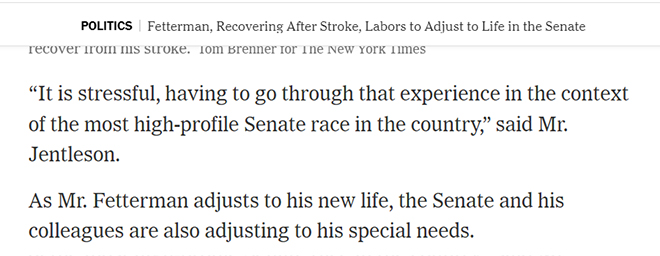 The New York Times published an article on Friday about the challenges faced by Fetterman as a Senator.