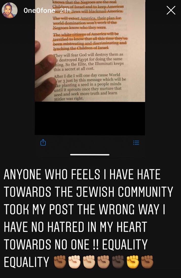 Over the week, Jackson posted two excerpts of quotes attributed to Hitler. The origin of the texts are unclear, but the content is decidedly anti-Semitic. The quote appears to claim white Jews will “extort America” and that “their plan for world domination won’t work if the Negroes know who they were.” In another Instagram story, Jackson commented approvingly on that passage.