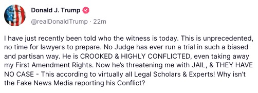 Around 7:30 a.m., Trump posted a complaint about how he was “just recently been told who the witness is today” before going on about how this process was “unprecedented,” giving his legal team “no time to prepare.” He then returned to attacks on Judge Juan Merchan, who on Monday threatened the former president with jail time for repeatedly breaking his gag order.