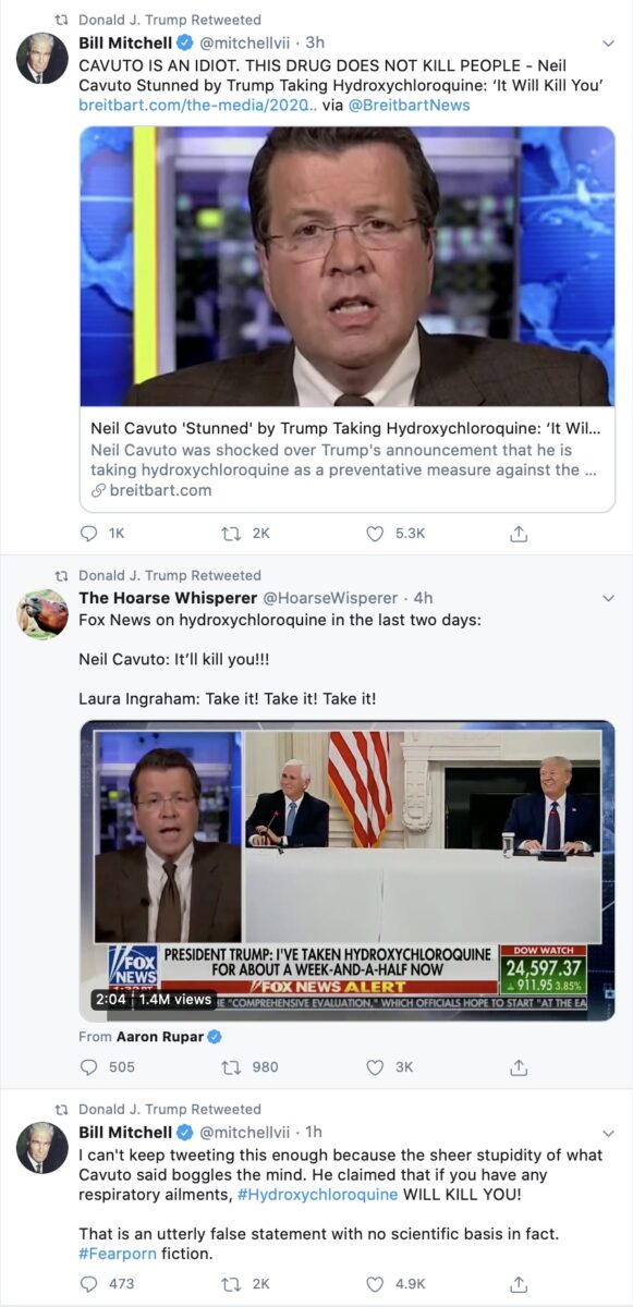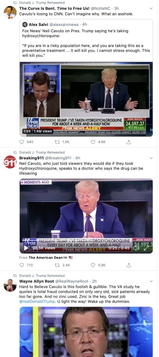 As you can see, the president shared a fair number of tweets that were all critical of Cavuto.
