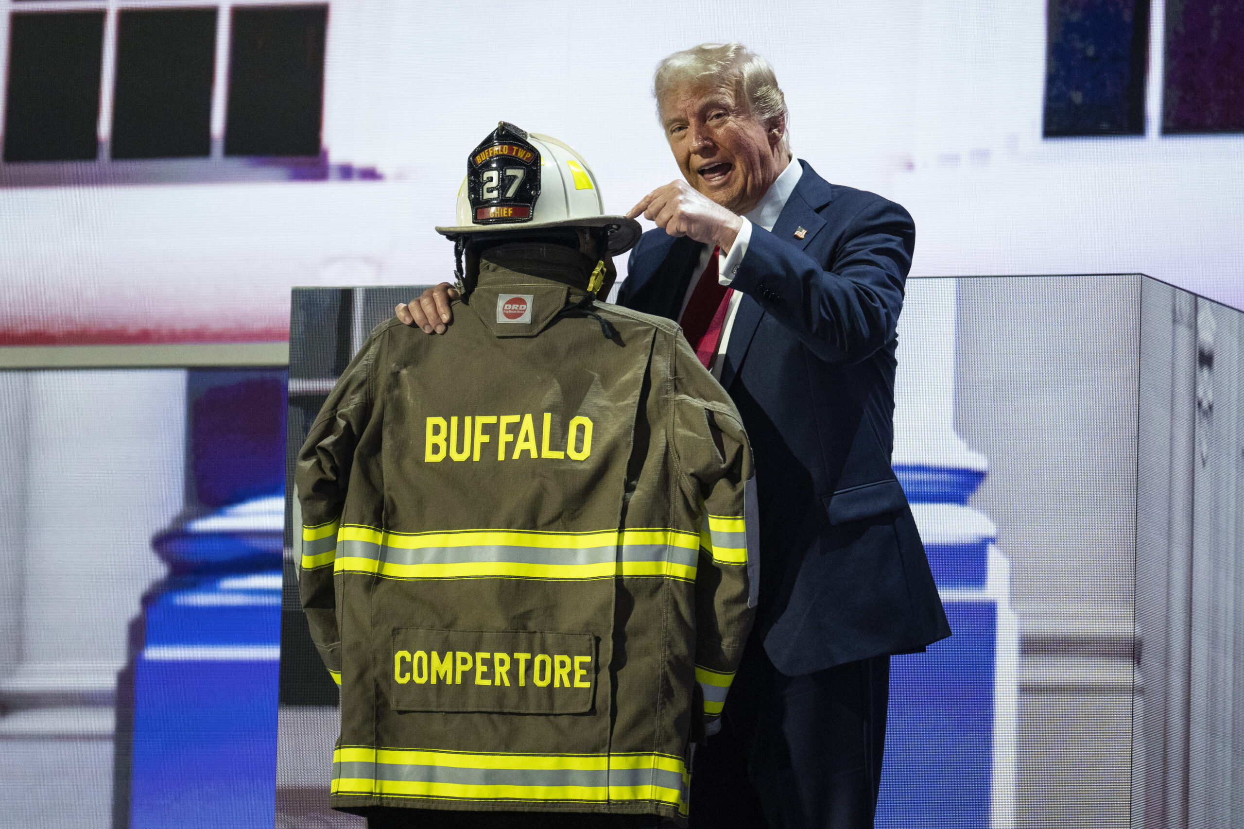 At the Republican National Convention in July, Comperatore’s firefighting gear was displayed on stage as Trump delivered his speech accepting the GOP nomination.