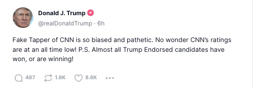 And no unhinged Trump rant would be complete without a shot at the media. This version mocked CNN’s Jake Tapper as “biased and pathetic”…