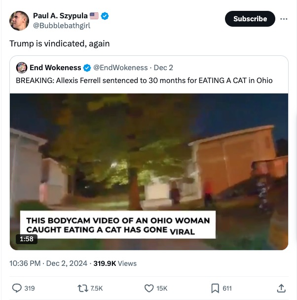 Far-right conspiracy theorist Alex Jones shared an X post about the woman’s sentencing on Dec. 2, alongside a Trump quote from the Sept. 10, 2024, presidential debate: “‘They are eating the cats and dogs.’ Donald Trump Oct, 2024.” The post received 1.8 million views and 41,000 likes in two days.