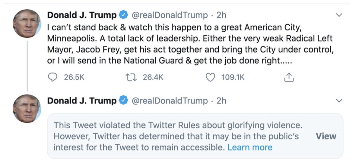 President Donald Trump commented on the civil unrest in Minneapolis following the killing of George Floyd under police custody in a series of early morning tweets, but it is Twitter’s response to his claim that “when the looting starts, the shooting starts” that will likely have the deeper political implications.