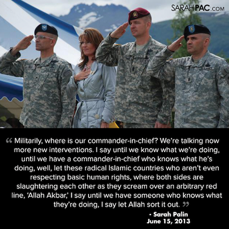 Of course, Palin summed up her opposition to intervention slightly more succinctly in a Facebook post notable for this memorable phrase: “Let Allah sort it out.”
