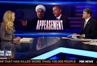 With a banner that read “APPEASEMENT” in all caps between photos of President Barack Obama and Iran’s Hassan Rouhani emblazoned across the screen, Ann Coulter joined Sean Hannity Monday night to discuss the deal diplomats made over the weekend to start scaling back Iran’s nuclear capabilities. Or as Hannity put it, “That’s right, President Obama is now openly negotiating with terrorists.”