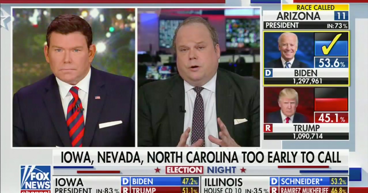 So Bret Baier and Martha MacCallum brought on Fox News politics editor Chris Stirewalt to explain how they could call Arizona for Biden when they couldn’t make any calls on Ohio yet. (During the segment, they cut in to officially call Ohio for President Donald Trump.)