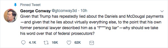 “Given that Trump has repeatedly lied about the Daniels and McDougal payments—and given that he lies about virtually everything else, to the point that his own former personal lawyer described him as a “f****ing liar”—why should we take his word over that of federal prosecutors?” Conway asked.