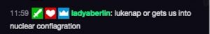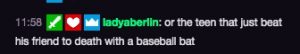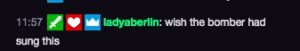 And Lady Aberlin’s comments during the song, straight from the Twitch chat: