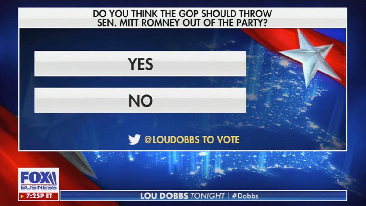 Before going to break, Dobbs teased his viewer poll inviting people to vote on whether the GOP should throw “RINO senator Mitt Romney” out of the party.
