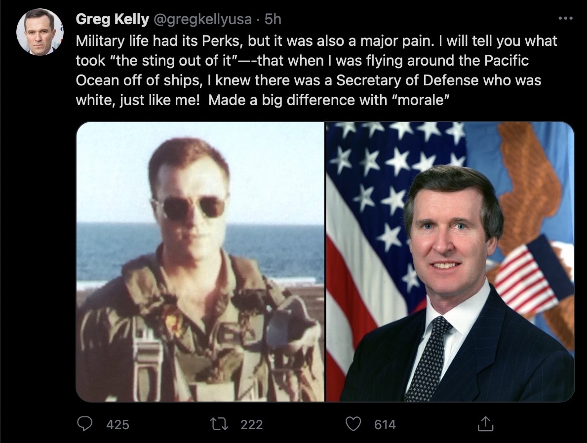 The now-deleted tweets praised former President Bill Clinton and Defense Secretaries William Cohen and Les Aspin — who Kelly served in the Marine Corps under — because they shared the same skin tone. Yes, he tweeted a number of “white, like me,” messages that many understood to be racist, or at least, irresponsibly racialized.