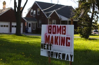 The story of the slightly provocative lawn sign comes from Amherst, New York, where Michael Heick has gotten fed up with the Jaffarya Islamic Center of Niagara Frontier situated next door to his house. Apparently, he’s been trying to get them to build a six-foot fence to block out their lights. They planted shrubs that will grow to six feet. That wasn’t good enough for Heick and the town wasn’t responding to his complaints so, obviously, it was time to accuse the religious center of terrorism.