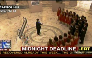 To Carl Cameron, the presence of a children’s choral group sweetly singing in the Capitol rotunda as Congress pushes ever closer to a government shutdown is “theater of the absurd.” Cameron, who seemed irritated by the sudden harmony of young voices rising to his live location, later lightened up and expressed regret that he couldn’t show viewers the group below him (Fox’s crew did later adjust and provide a shot) and he said the music “sounds pretty good.”