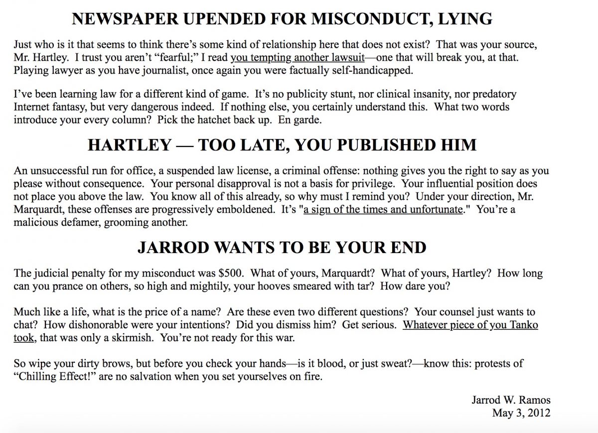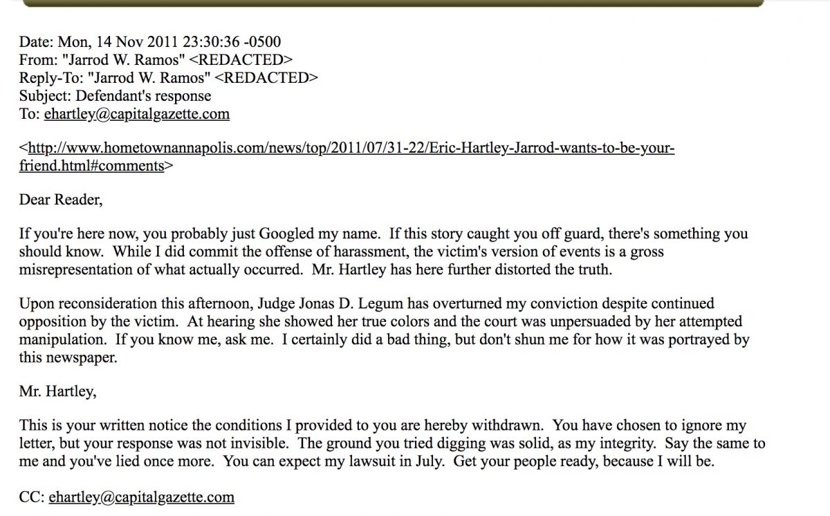 Jarrod Ramos of Laurel made the defamation claim in Prince George’s County Circuit Court in 2012 after a 2011 column by then-Capital staff writer Eric Hartley about Ramos’ guilty plea to criminal harassment.